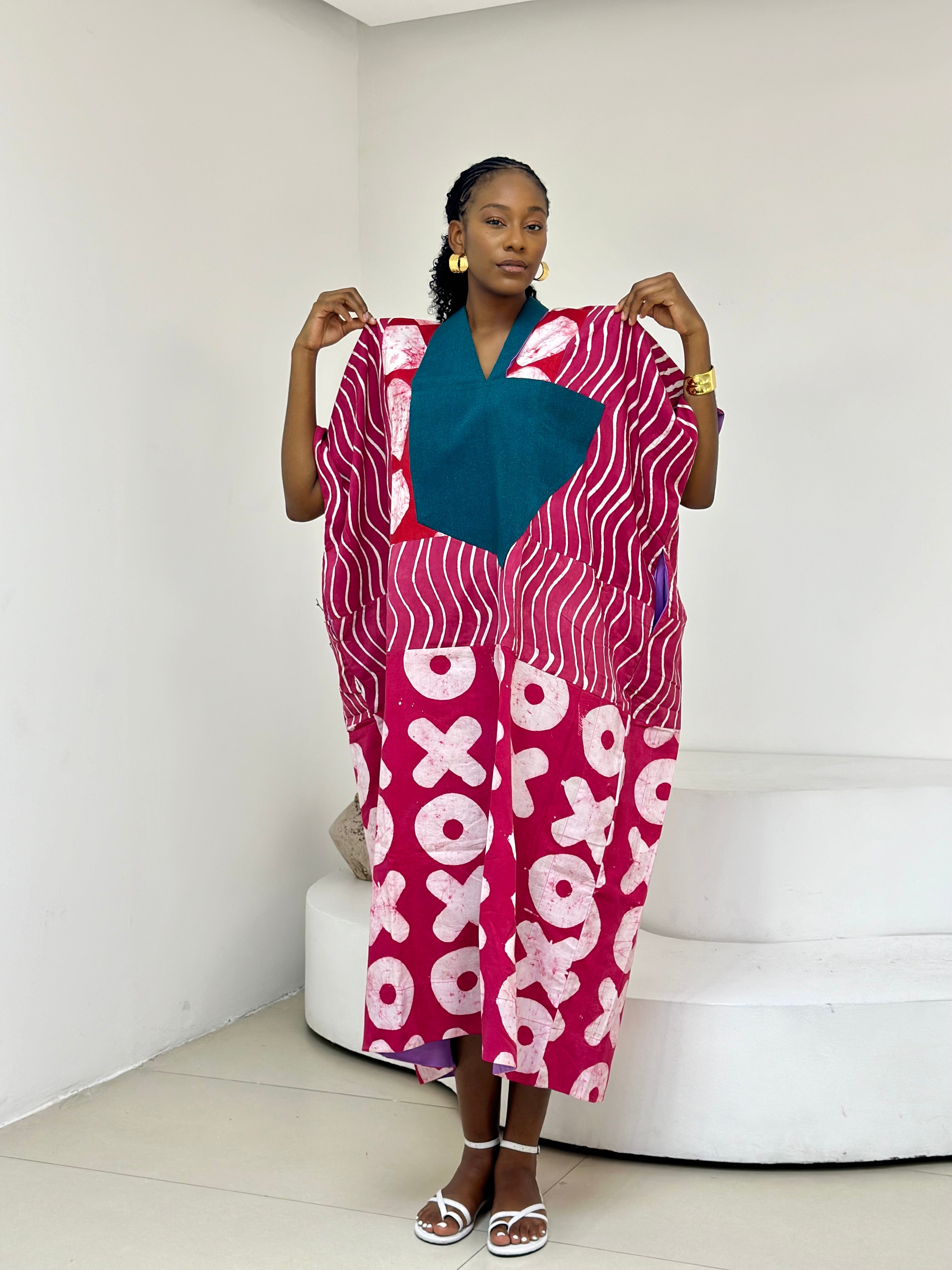 pink and white multiprint agbada with shimmer green asooke collar